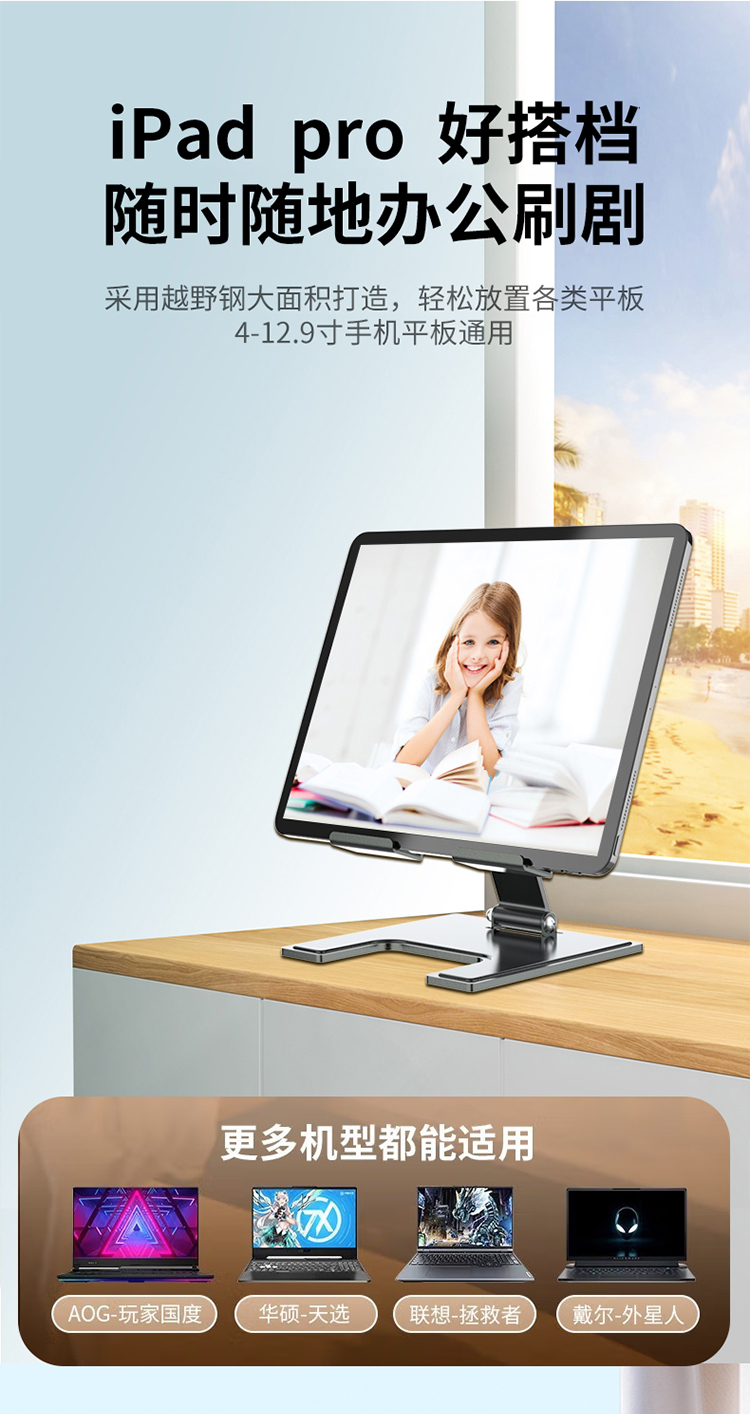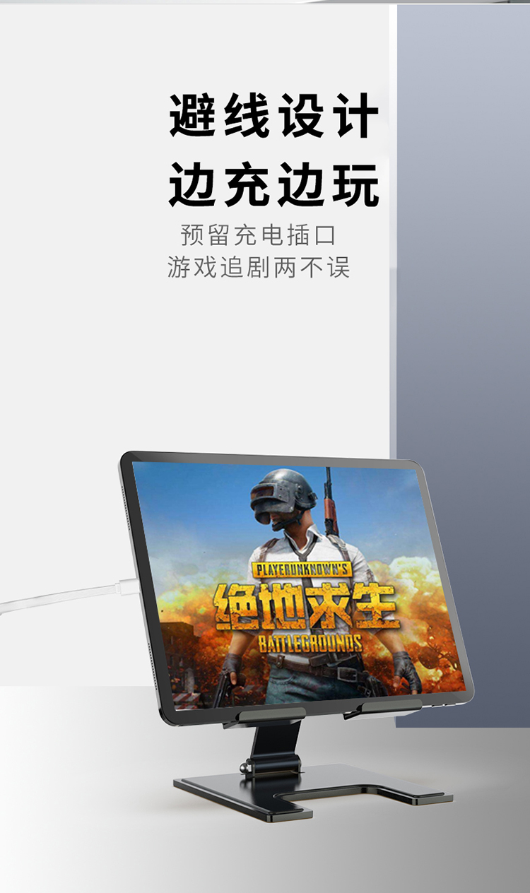 稳固支撑,喷砂耐氧化,遇水不掉漆,硅胶防滑,4-12.9寸手机平板通用,避线设计边充边玩