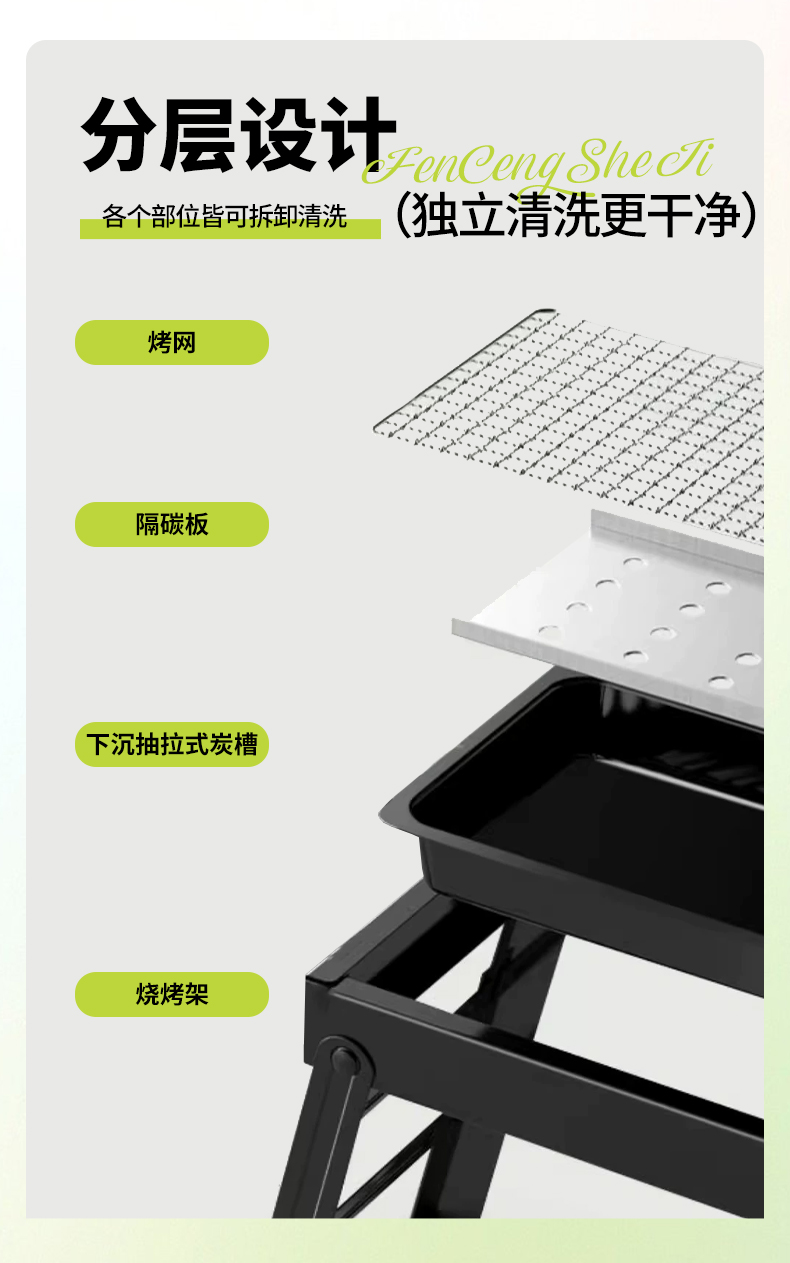 优质碳槽易清洁:碳槽采用全新专利,凹凸设计,可以减少木炭和烧烤底部直接接触,加大通风空间。