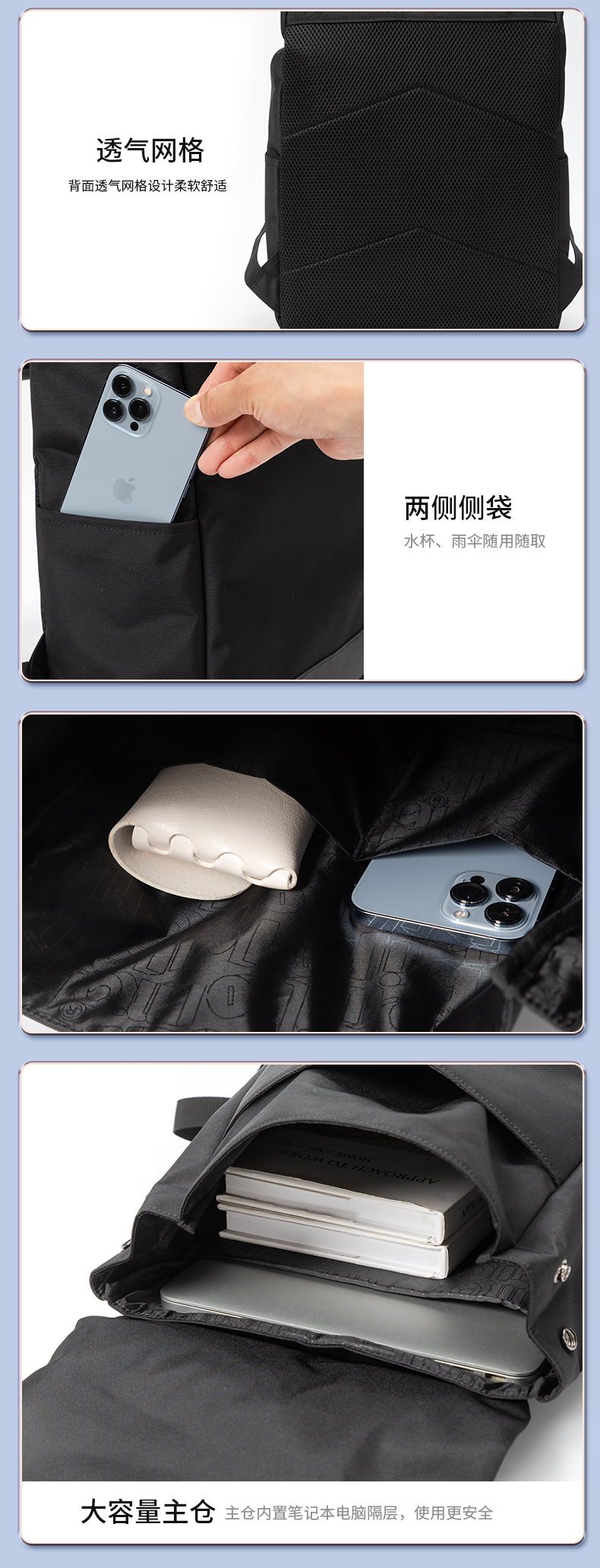 ● 防泼水面料, 能更好保护包内物品